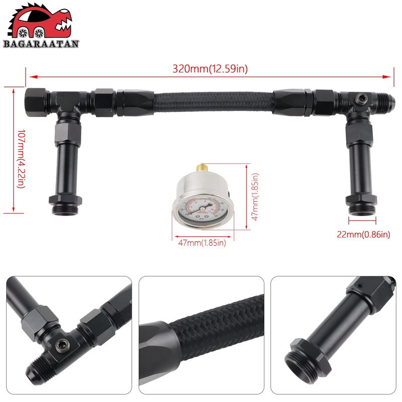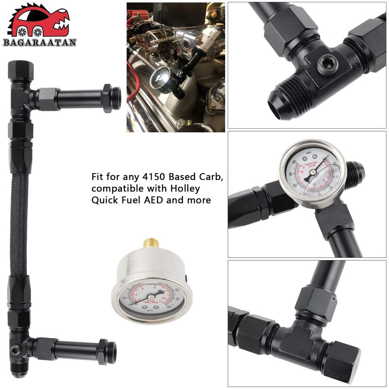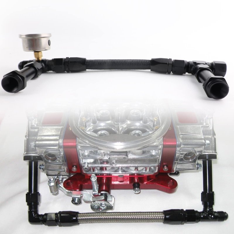 【Apply to】Fit for any 4150 Based Carb, compatible with Holley Quick Fuel AED and more 【Premium Material】: Made of lightweight aluminum. The black anodized surface for enhance its oxidizing, rusting and corrosion resistance. The Hose is stainless steel braided. Adjustable 0-160 PSI Gauge. 【Thread Size】Perfect for Holley 4150 Style Carburetors with 7/8" - 20 Fuel Bowl Fitting and comes complete with stanchions to attach them to the carburetor! Designed for a great fit on Holley Carbs with a 9-5/16" Center to Center. This fuel log has a 3/8" NPT Female Inlet Fitting, 1/8" NPT fitting in the rear and another 1/8" NPT fitting near the front for a fuel pressure gauge 【Mateial】The fuel line kit consists of aluminum black anodized part and stainless steel braided hose.The pre-assembled fuel lines clean up your engine compartment and properly deliver fuel to your carburetor. Deliver the right amount of fuel at the correct rate to power your performance ride on the strip or street. 【Easy to Install】: Package comes with a pre-assembled braided stainless steel carburetor dual line kit, so easy to install. Notice: If the hose ends leaked, it is recommended to use a lace or tape to seal it. If the length size is not suitable, you can DIY trim.