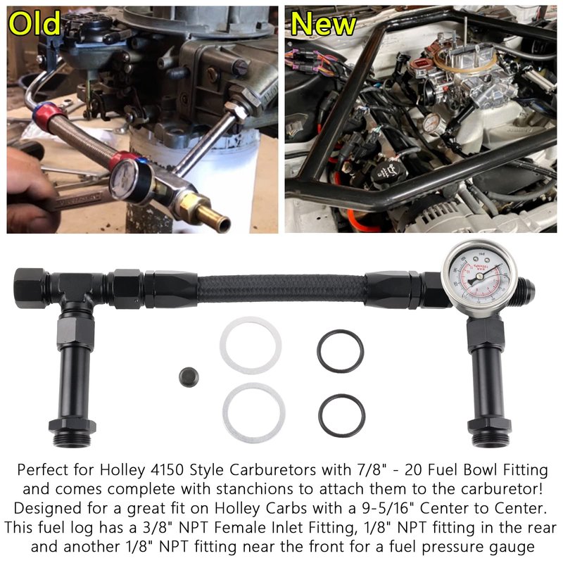 - 【Thread Size】Perfect for Holley 4150 Style Carburetors with 7/8" - 20 Fuel Bowl Fitting and comes complete with stanchions to attach them to the carburetor! Designed for a great fit on Holley Carbs with a 9-5/16" Center to Center. This fuel log has a 3/8" NPT Female Inlet Fitting, 1/8" NPT fitting in the rear and another 1/8" NPT fitting near the front for a fuel pressure gauge