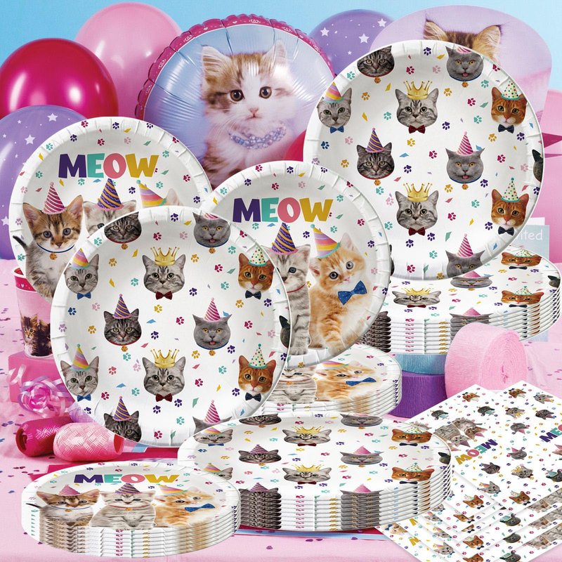 - 3.Add a touch of whimsy to your party with our beautiful cat birthday dinner plate and napkin set, featuring meow letters, cat paw prints, and charming kitten illustrations. These cat party supplies are the perfect choice for cat lovers of all ages.