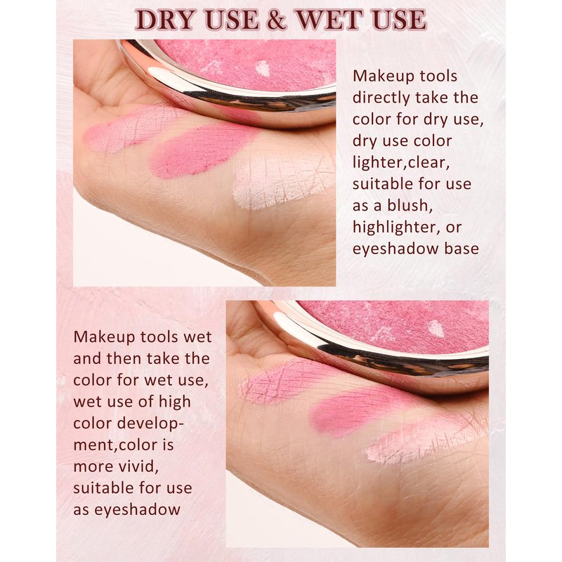 - MULTI-FUNCTIONAL USE - Baked powder can be used not only as a blush, highlighter but also as an eyeshadow, dry use is light and low-pigmented, wet use is highly pigmented. Baking powder instantly enhances your overall face look for a three-dimensional finish. Very clearly visible shimmer, smooth, highly pigmented baked pressed powder that blends easily and evenly, with high glow for a natural shimmer finish.