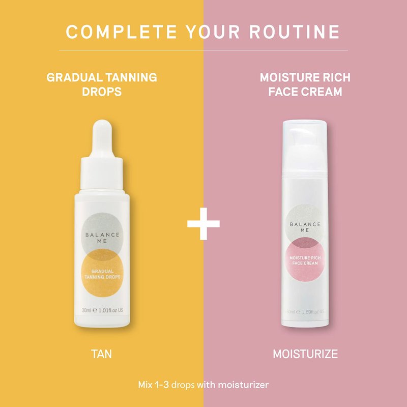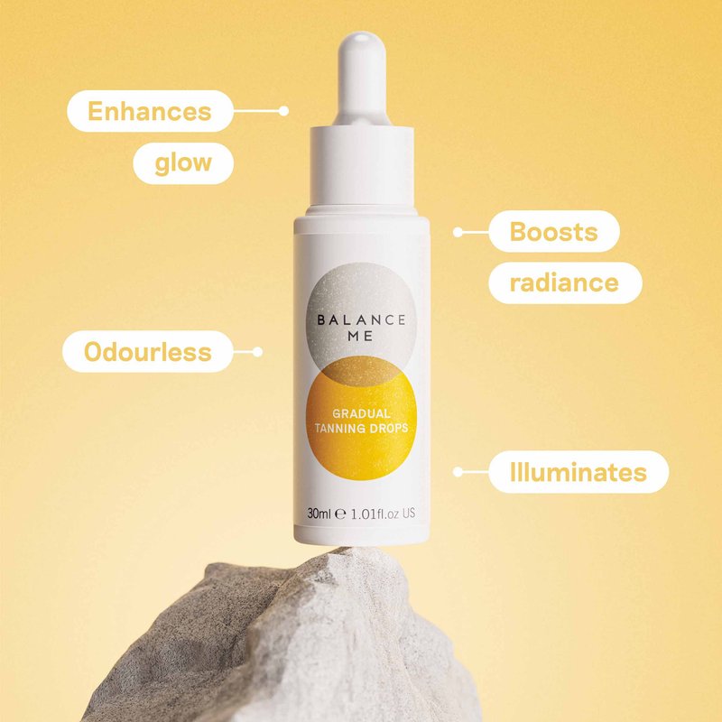 - Customizable Glow: Achieve the perfect self tan by adding Balance Me Gradual Tanning Drops into your favourite lotion or serum. Control your glow with ease, whether for your face or body, with these sunless tanning drops