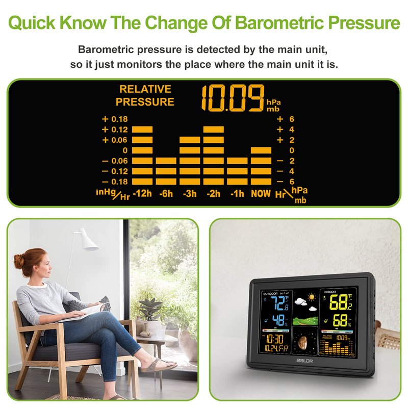- 【Automatic Barometric Pressure】Color display weather station comes with a barometer histogram of dynamic historical data display on the screen, quick view the barometric changes in the past 12 hours. Additionally, the color digital weather station is equipped with a customized weather clock with snooze function that can remind you of what you are about to do at any time.