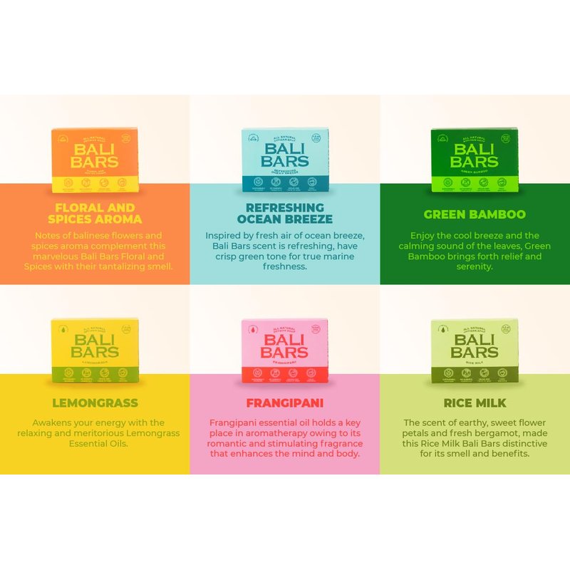 - DELIGHTFUL SENSE PAMPERING EXPERIENCE: Each pack includes 6 x luxurious handmade soap bars with a variety of tropical scents and herbs that will awaken your senses. Comes with Balinese Resorts and Spa signature smell from Lemongrass, Frangipani, Green Bamboo, Refreshing Ocean Breeze, Floral and Spices, and Rice Milk.