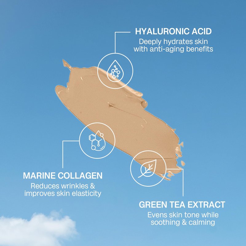 - ENRICHED WITH SKINCARE INGREDIENTS Enriched with green tea, hyaluronic acid and marine collagen to rejuvenate and renew the skin. It's lighter than a foundation but provides more coverage and benefits than a tinted moisturiser.
