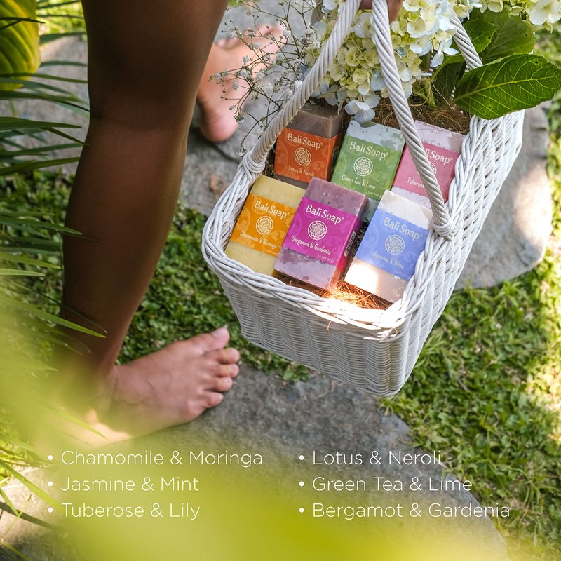 Bali Soap - Feminine Collection Natural Soap Bar Gift Set, 6 pc Variety Pack, Bergamot-Gardenia, Jasmine-Mint, Lotus-Neroli, Chamomile-Moringa, Tuberose-Lily, Greentea-Lime 3.5 Oz each