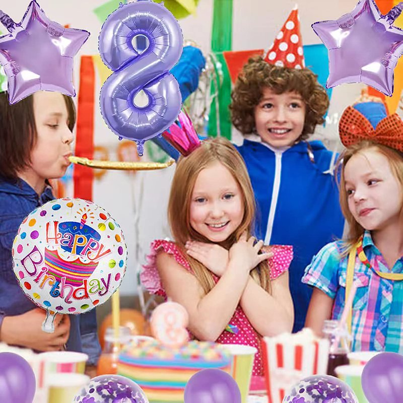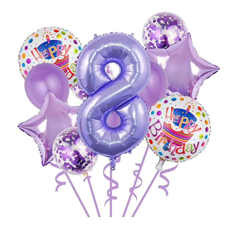 • Package comes with 1pcs 32 inch Number 8 Foil Mylar Balloons, 2 pcs 18 inch Letter Balloon, 3 pcs 12inch purple latex balloon, 3 pcs 12 inch purple confetti balloon, 2 pcs 18inch stars,1 ribbon.