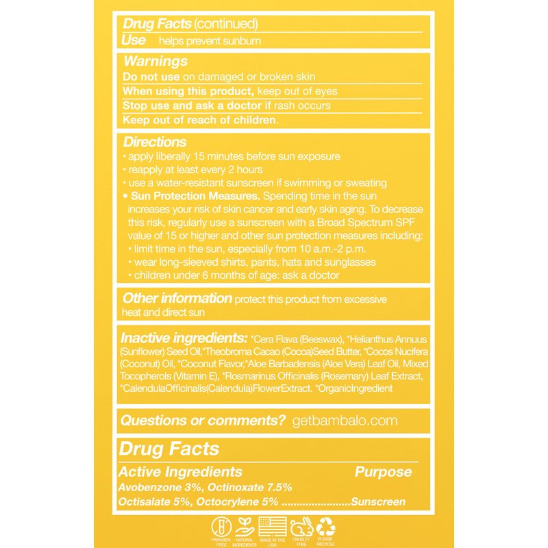 Introducing the Bambalo SPF 15 Sunscreen Lip Balm Coconut Flavor 4-Pack, thoughtfully created for those who crave the creamy, tropical essence of coconut in their lip care routine. This coconut-flavored collection ensures your lips are cloaked in protection, moisture, and a rich, aromatic scent. Formulated with natural beeswax and infused with the healing benefits of Aloe and Vitamin E, our lip balm is the premier choice for maintaining your lips soft and moisturized throughout the day. Our formula extends beyond simple sun protection; it is devised to protect, rejuvenate, and hydrate your lips, marking it as an indispensable part of your daily lip care practices. The coconut flavor adds a soothing, exotic twist to your lip care experience, transforming each application into a moment of tropical indulgence. Our dedication to quality is demonstrated in our PABA and paraben-free formula, signifying our commitment to your health and safety. Proudly produced in the USA with 100% renewable energy and a dedication to reducing plastic consumption, selecting the Bambalo Coconut Flavor 4-Pack means you are choosing exceptional lip care while supporting environmental sustainability. Experience the blend of effective sun protection, the luxurious aroma of coconut, and a commitment to eco-consciousness with Bambalo's specialized lip care solution.
