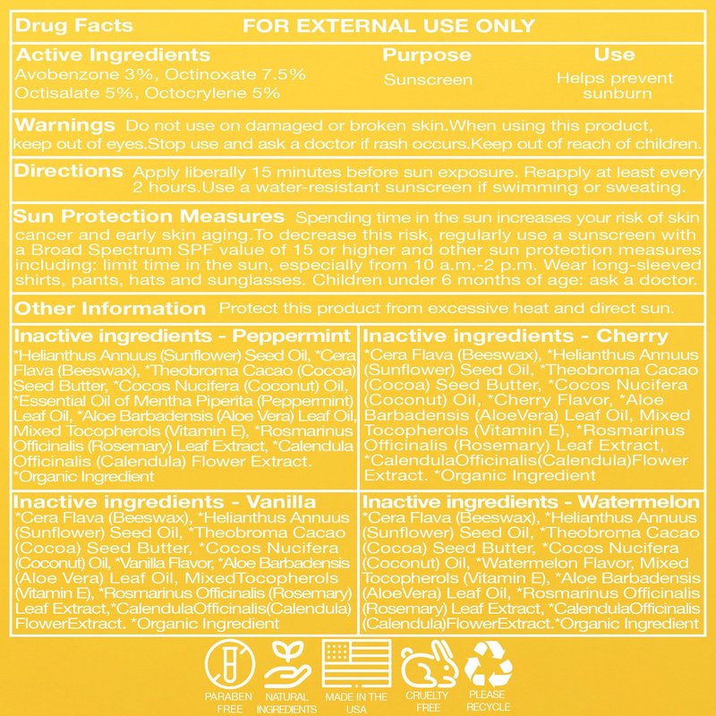 - SPF 15 Sunscreen Lip Balm - Discover our SPF 15 lip balm in a new 4-pack variety. Enjoy flavors like Cherry, Peppermint, Vanilla, and Watermelon. Enriched with Aloe and Vitamin E for moisturizing protection. Made with organic ingredients and natural beeswax, perfect for everyday use. Ideal for lip care, lip sunscreen, and chapstick total hydration. Great for bulk chapstick lovers who seek the best lip balm for everyday hydration.