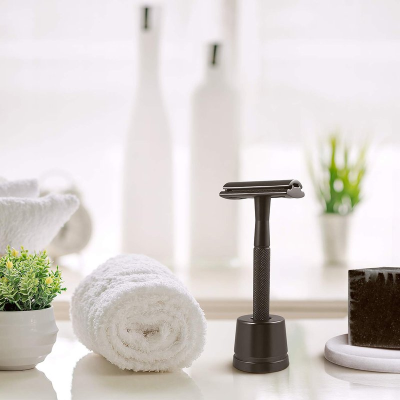 This razor has a safety razor stand included. It is also made from metal and designed to perfectly fit your beard razor. With the stand you can easily store the black safety razor for men upright in the bathroom or shower.