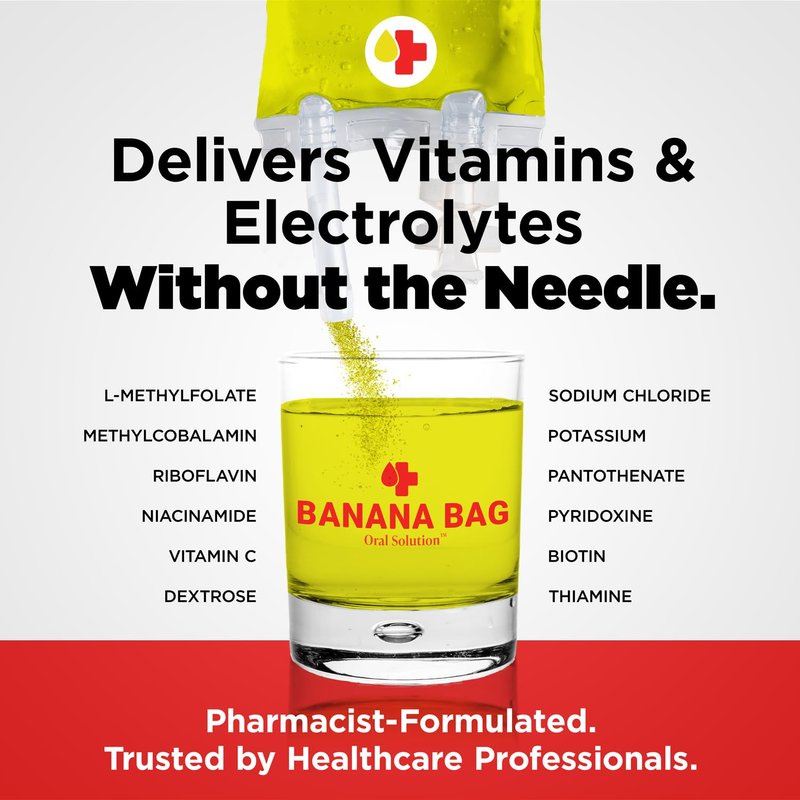 Banana Bag Oral Solution (BBOS) is a Powerful, Pharmacist-Developed Alternative to the Typical "Banana Bag" Therapy of Vitamins & Electrolytes Given Intravenously in Healthcare Settings. Now Available in a Convenient, Portable, Fast-Acting Powder to Dissolve in Water and Drink that Can Effectively Manage Dehydration, Exhaustion, and Immune Health on a Therapeutic Level at Home or Wherever you Need Clinical Relief... No Needles Necessary.