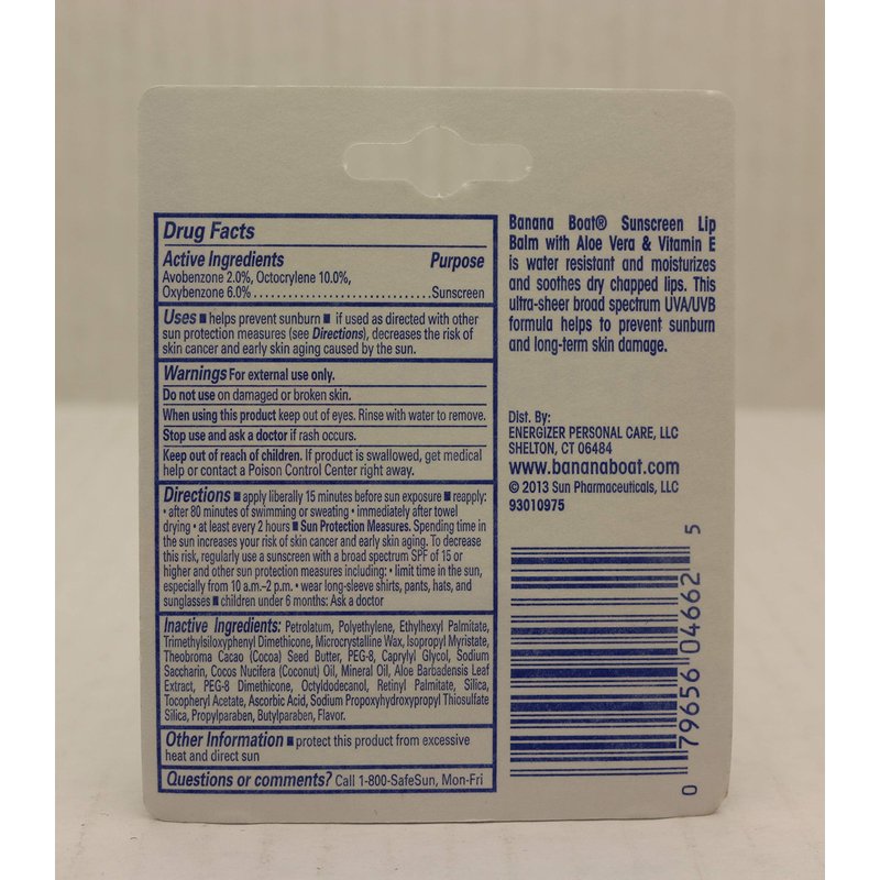 Banana Boat Sunscreen Lip Balm SPF 45 with Aloe Vera & Vitamin E presents the perfect solution for soft, protected lips. This lip balm not only moisturizes and conditions but also shields sensitive lips with broad-spectrum UVA/UVB protection that endures as long as your fun lasts*. Formulated with aloe vera & vitamin E, it's ideal for everyday use and remains water-resistant for up to 80 minutes*. Ensure reapplication as directed on the product label for continued protection. This 0.15oz lip balm, crafted with aloe vera & vitamin E, serves as an excellent daily companion, keeping lips hydrated and nourished. With a moisturizing effect that lasts up to 12 hours, it alleviates dryness, providing soothing relief to your lips. Featuring ultra-sheer, UVA/UVB broad-spectrum protection, this lip balm ensures defense against sunburn and long-term sun damage, making it an essential part of your lip care routine. Banana Boat Sunscreen Lip Balm SPF 45 with Aloe Vera & Vitamin E is designed to last as long as your day of enjoyment, offering protection that aligns with your active lifestyle. Remember to reapply as directed on the product label to maintain consistent and effective protection for your lips. NDC Code(s): 63354-971-61.