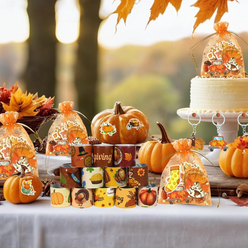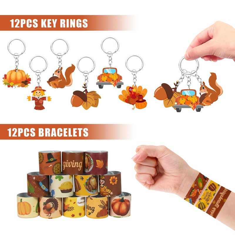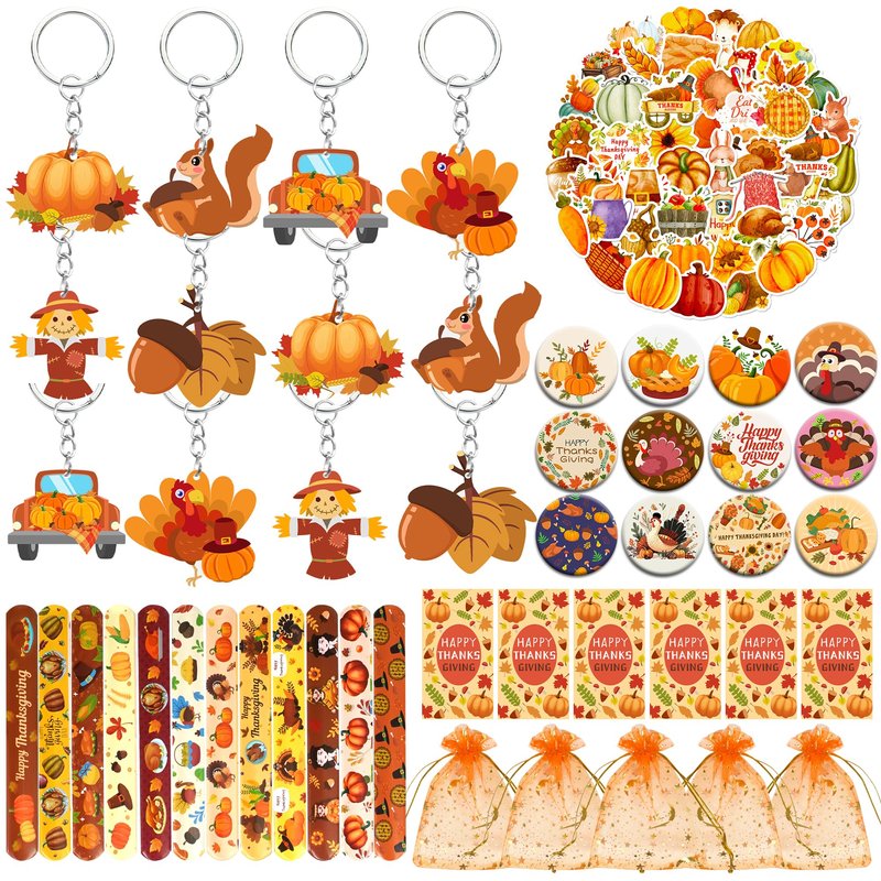 BANBALLON 110 PCS Thanksgiving Party Favors Autumn Party Supplies with Key Chains Button Pins Stickers Rubber Bracelets for Fall Party Favors Decorations Classroom Prizes