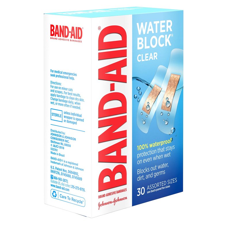 - 30-Count box of 100% waterproof Band-Aid brand water block clear adhesive bandages in assorted sizes for minor cuts and scrapes