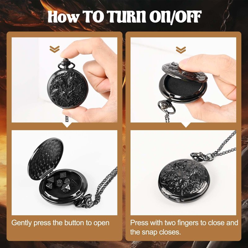 - WHAT YOU WILL GET:7pcs polyhedral metal dice set d&d,a creative and unique dragon pattern pocket watch case,2 noise reduction tabs to minimize the noise made by the dice rolling,a small storage bag for easy access to the dice,and a black box for all the small items