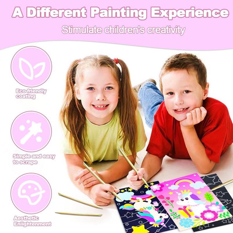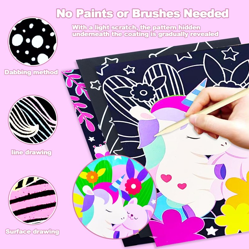 - ✍【Magic Scratch Art 】Scratch the surface of the black scratch paper with a wooden pen to reveal a hidden world of vibrant and magical colors. The scratch paper is a unicorn design that kids love so much, scratch the surface to get an unicorn art painting. Even the same scratch pattern can create different effects! Everyone can take the time to play, think, test and prepare for their masterpieces.