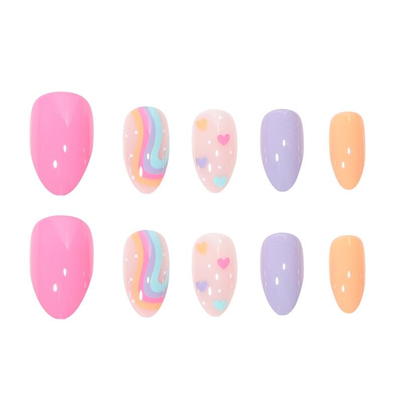BAOYAALIN Press on Nails Medium Almond Shaped Fake Nails with Rainbow Colorful Heart Design Full Cover False Acrylic Glue Stick on Nail for Women Girls 24Pcs