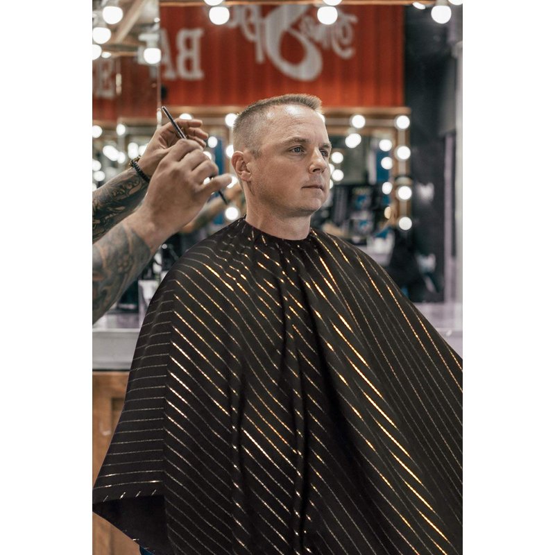 Barber Strong The Barber Cape Haircut Cover for Men, Hair Repelling and Static-Reducing Material, Flexible Elastic Neckband, Water Resistant Fabric, Oversized for Complete Coverage - Gold Pinstripe