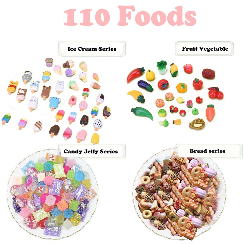 - 【Value cute miniature accessories set】150 Value Packs that contain -- 110 Foods + 20 Drinks + 10 Plates + 10 Forks. Mixing colors and shapes randomly, enough quantity and styles, can help relieve stress, develop creativity and imagination, and bring you a lot of fun.