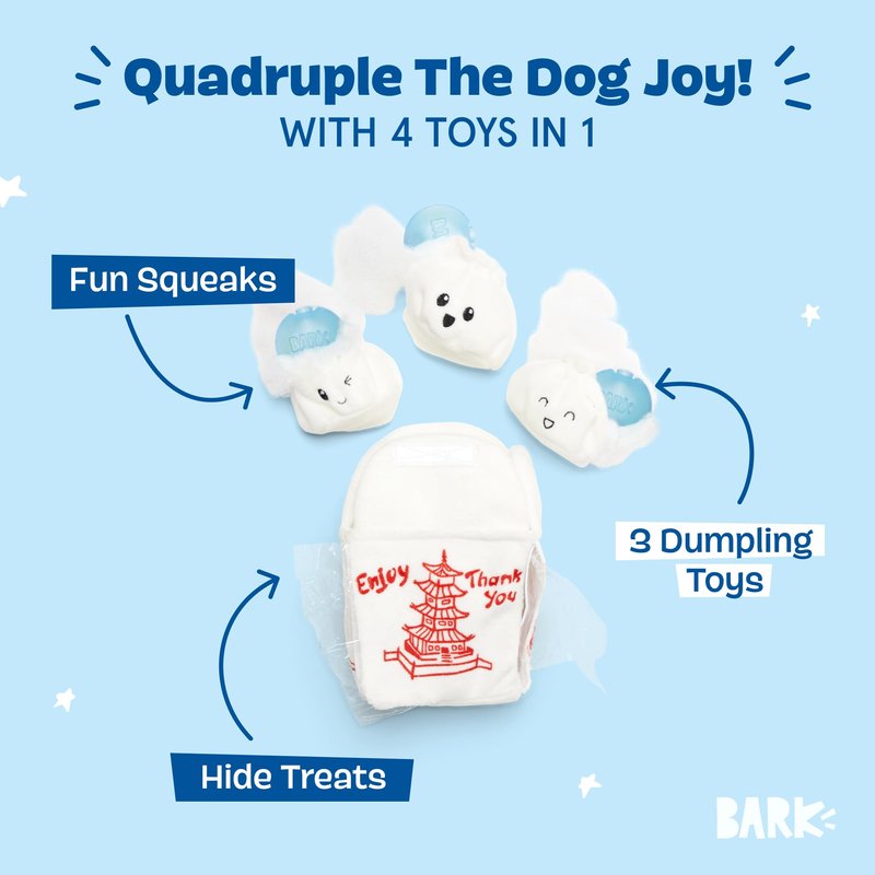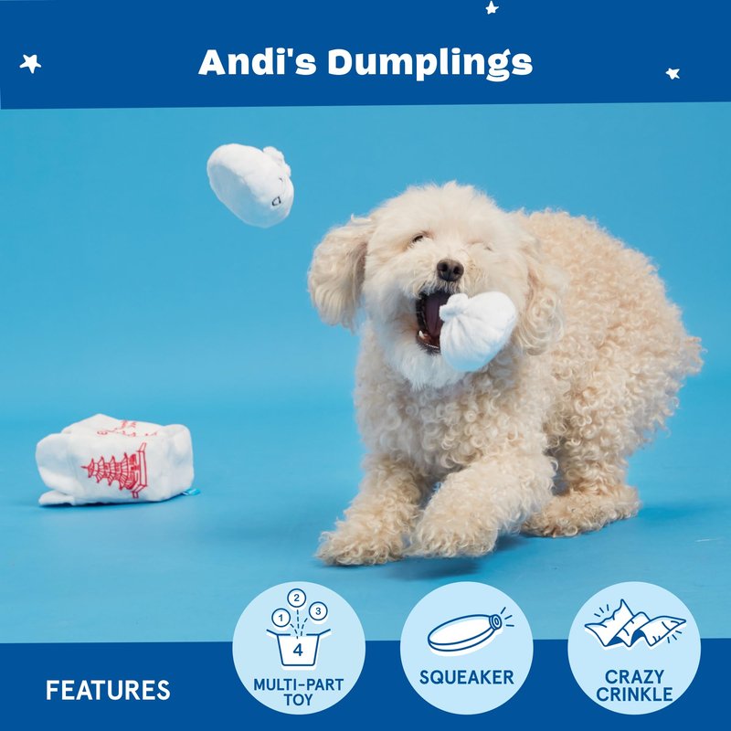 - MEET ANDI'S FAMOUS DUMPLINGS - Satisfy your dog's instincts with this 2-in-1 crinkly carry-out carton stuffed with plush and squeaky dumpling balls! Perfect for fetching fun and mental stimulation, this toy will keep your dog busy and happy. Keep the carry-out carton away from the fridge - your dog won't want to miss out on this delicious delight.