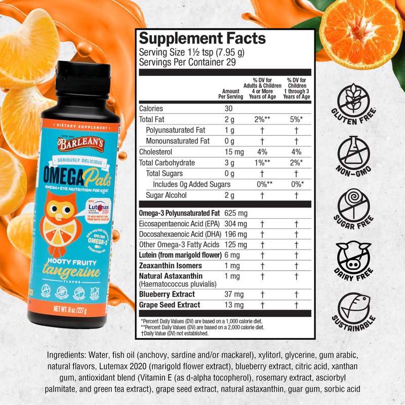 Barlean's Omega Pals Eye Health Liquid, Tangerine Flavored Omega 3 for Kids, Fish Oil Supplement with 500 mg of EPA & DHA Plus Lutein & Zeaxanthin Vitamins for Blue Light Support, 8 oz