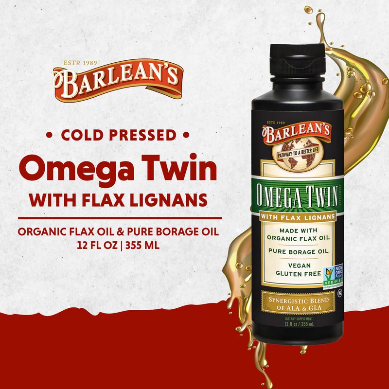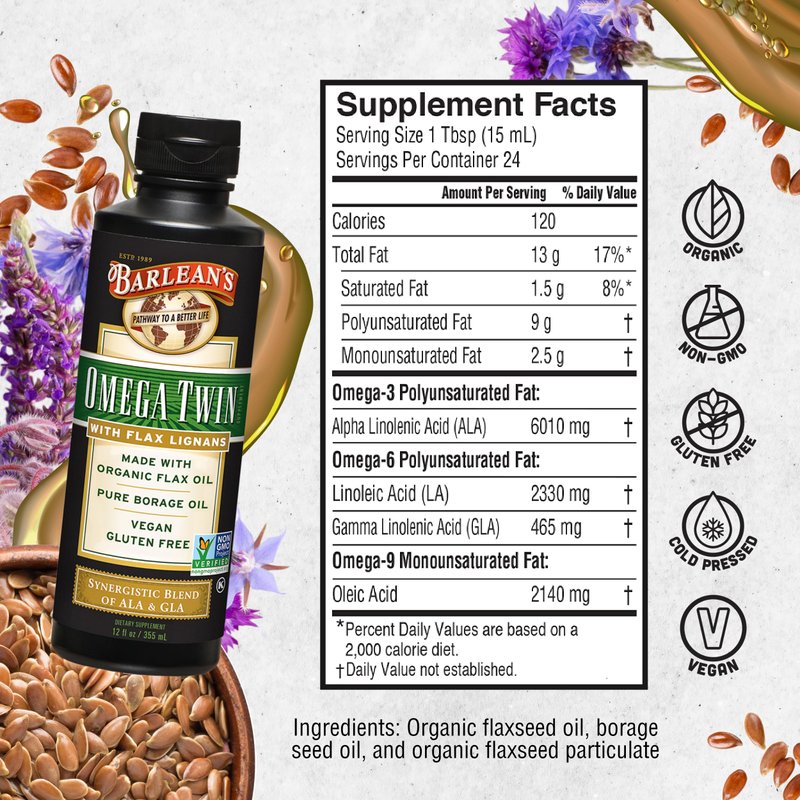 Barlean's Omega Twin Liquid Flaxseed Oil and Pure Borage Oil Supplement with Lignans, 6,010mg ALA and 465mg GLA Omega Fatty Acids from Organic Flax Seed and Cold Pressed Borage Seeds, 12 oz