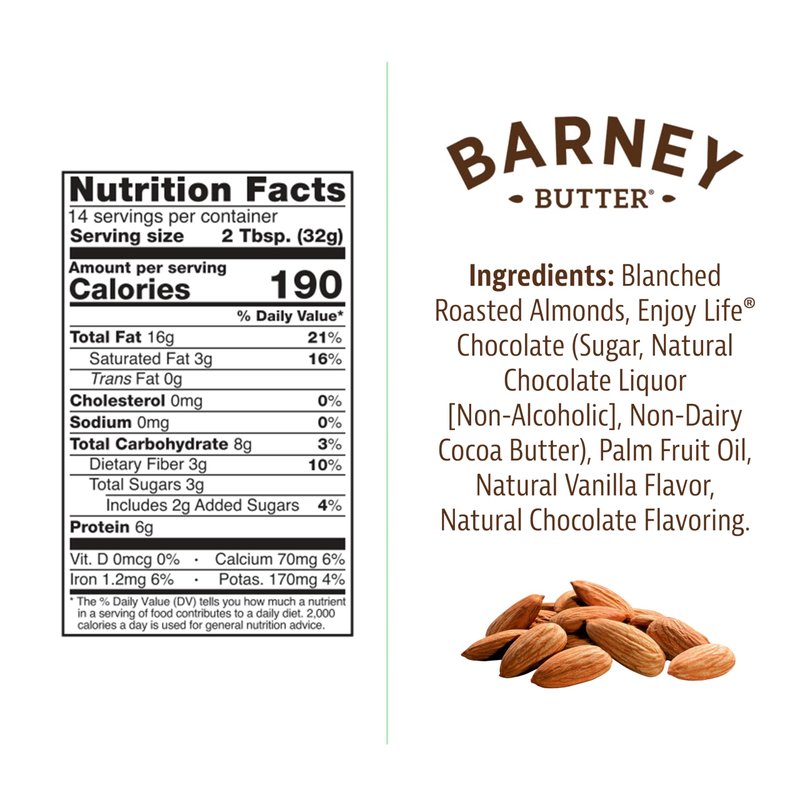 - SCRUMPTIOUSLY SMOOTH: Contains a 16-ounce jar of Barney Chocolate Almond Butter. Super-smooth and spreadable nut butter blended with melted 'Enjoy Life' chocolate. Delicious chocolate taste and only 3 grams of sugar per serving