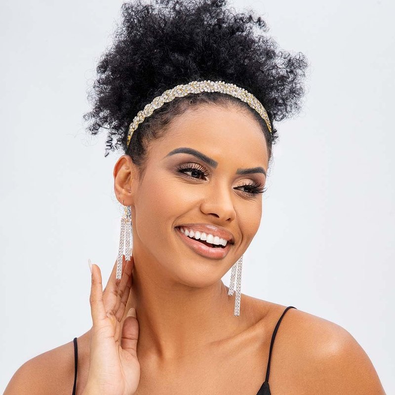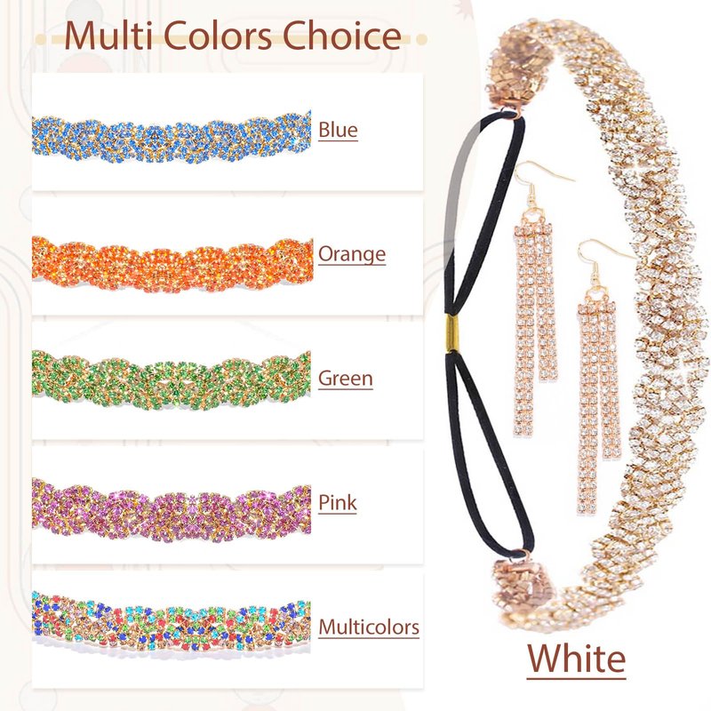 - Rhinestone headband earrings set is adorned with multi-colored crystals, expertly set in a durable Rhinestone foundation, and secured with a sturdy elastic cord, ensuring both comfort and longevity.