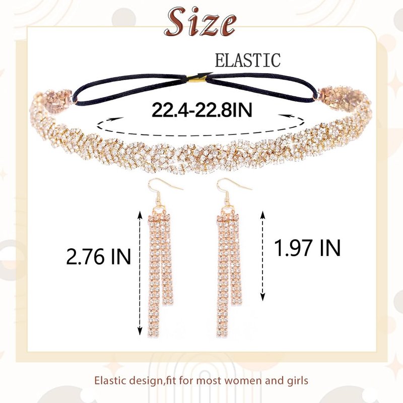 - Shiny headband length is between 22.4 to 24.8 inches, offering a flexible fit that caters to a variety of head sizes for the modern women.These earrings feature two strands of rhinestone chains, measuring 1.96 inches and 2.75 inches in length respectively.