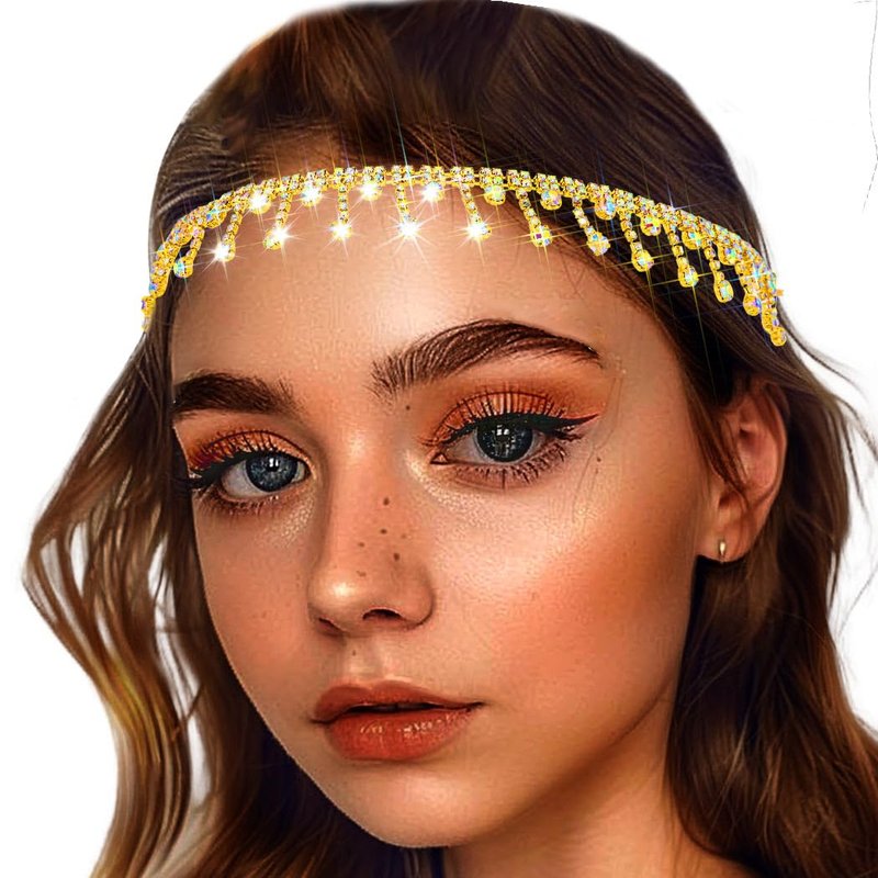 Barode Rhinestone Head Chain Tassel Forehead Bridal Headband Elastic Crystal Hair Band Prom Headpieces for Women (AB Gold, Free size)