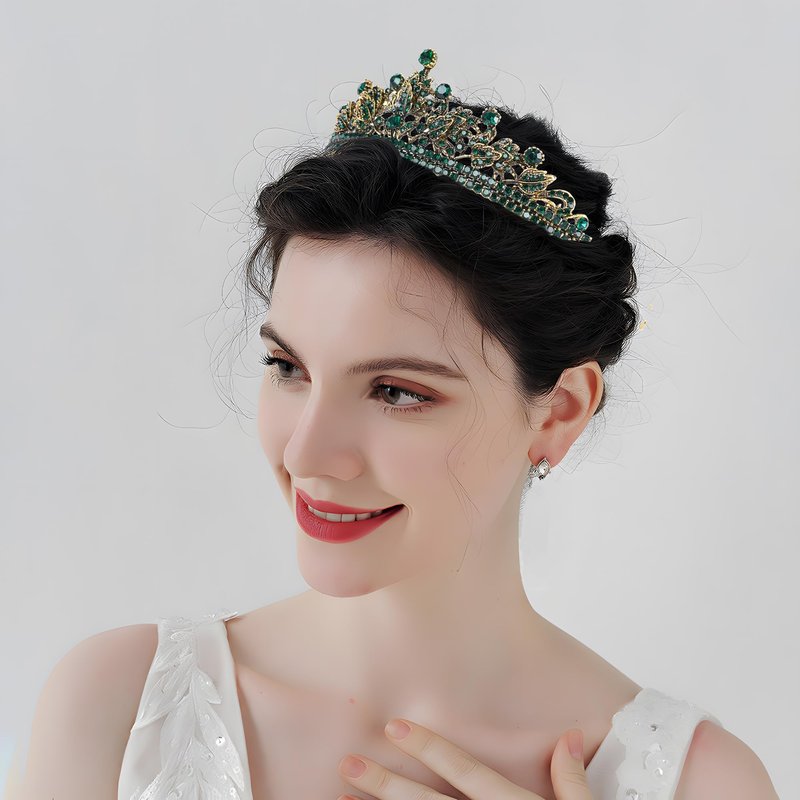 • Material: Rhinestone wedding crown and tiara is made of alloy, green rhinestones and crystals. Vintage Gold color and baroque style for women