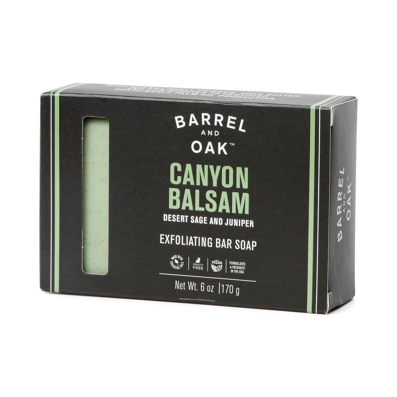 Barrel & Oak - Exfoliating Bar Soap, Men's Soap Bar, Deep Cleans Pores & Removes Dead Skin, Certified Sustainable Palm Oil, Charcoal Powder, & Olive Stone, Vegan (Canyon Balsam, 6 oz)