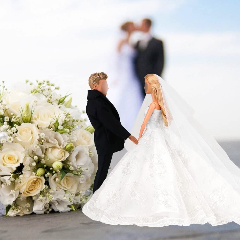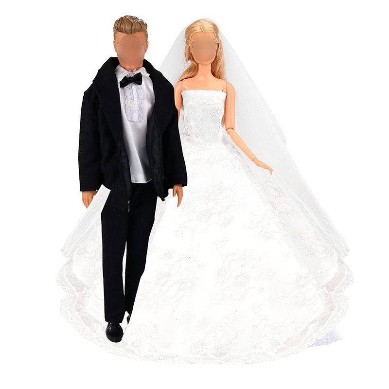 BARWA Wedding Set White Wedding Dress with Veil and Formal Suit Outfit for Boy & Girl Dolls