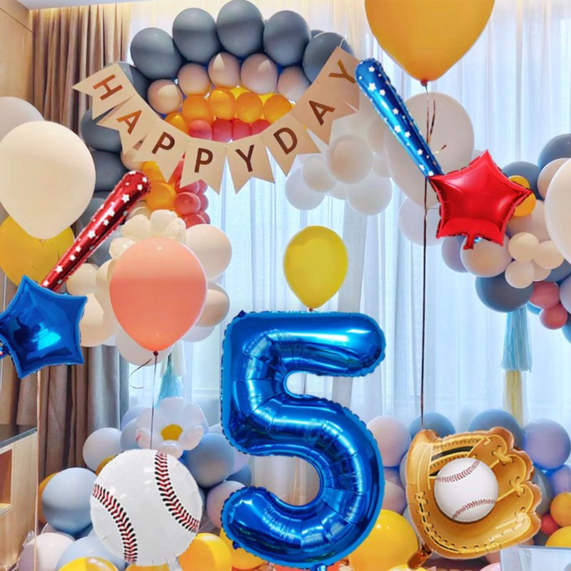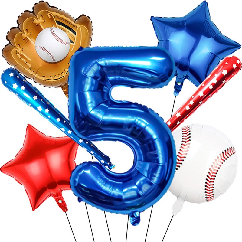 - 【Baseball party balloons】Baseball balloon number ballons set has 40 inch navy blue number 5 balloon x 1, 18inch foil baseball balloons x1,18inch baseball glove balloons x 1, 18inch star balloons (1blue, 1 red),29.5inch baseball bat balloon(1 dark blue, 1 red),straw x 1, ribbon x 1.Tips: Balloon sizes are the size before inflation. The size after inflation will be slightly smaller than the size before inflation.