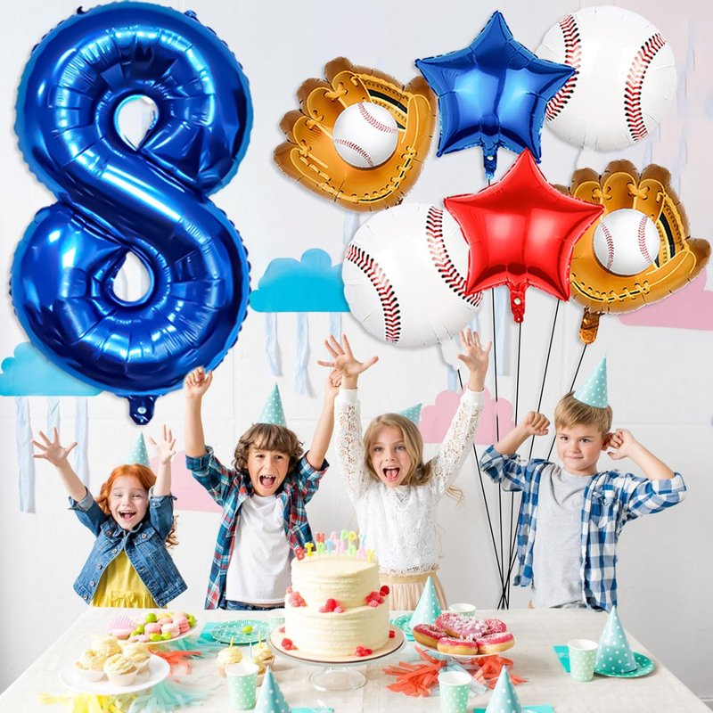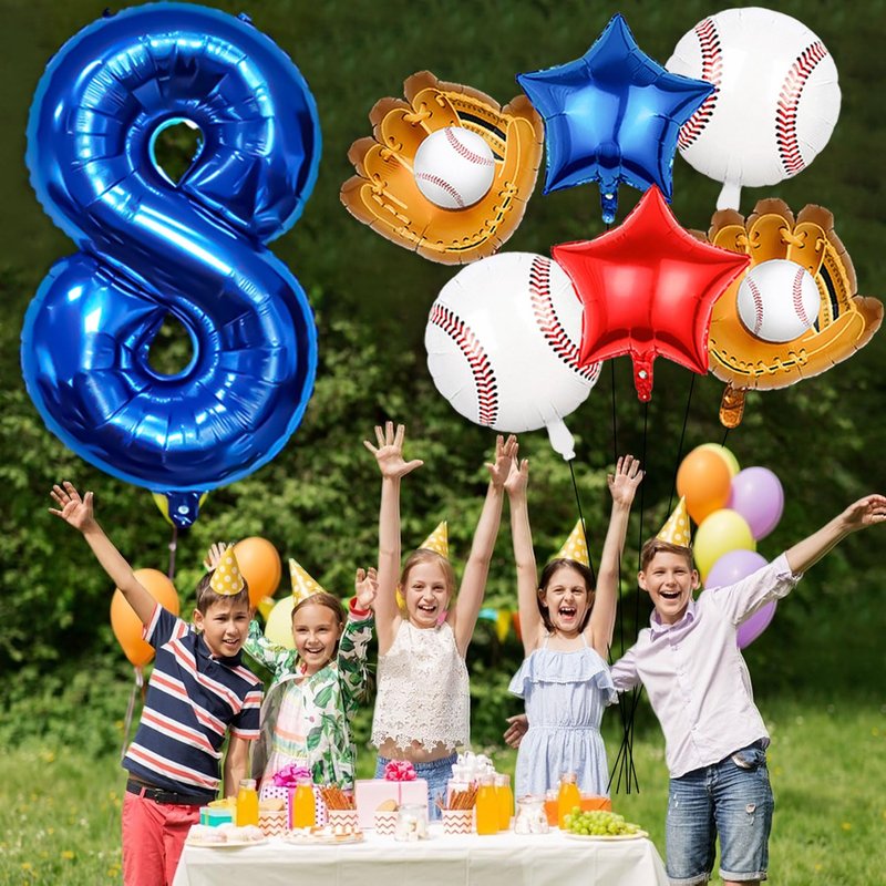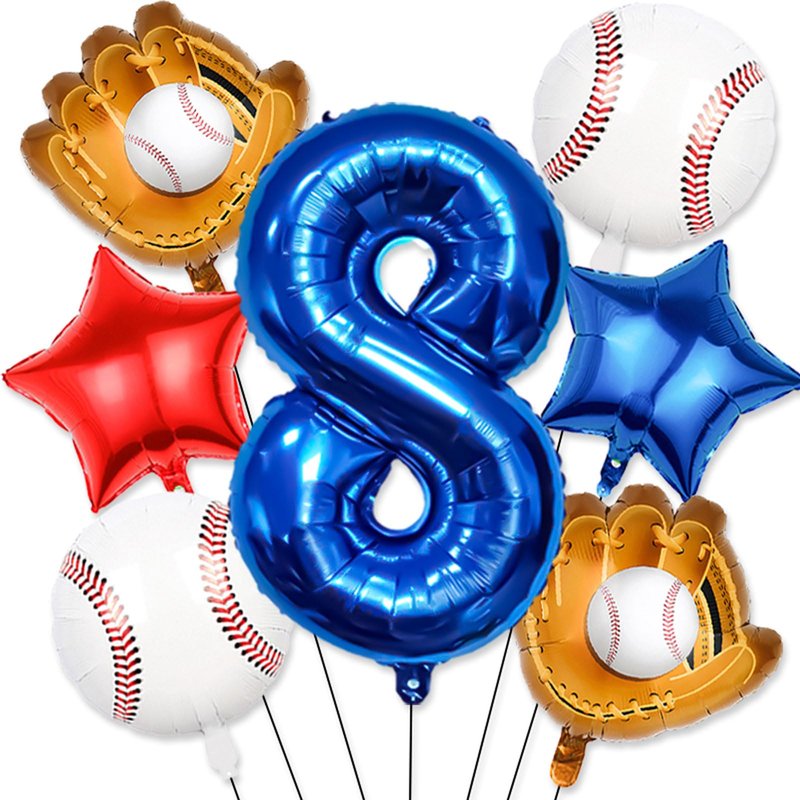 - 【Baseball party balloons】Baseball balloon number ballons set has 40 inch navy blue number 8 balloon x 1, 18inch foil baseball balloons x2,19.6*18.3inch baseball glove balloons x 2, 18inch star balloons (1 dark blue, 1 red),straw x 1, ribbon x 1.