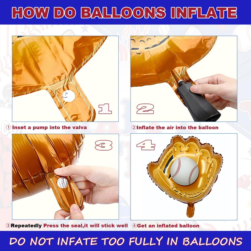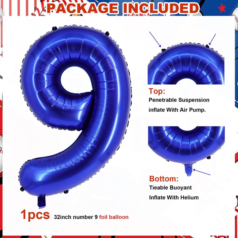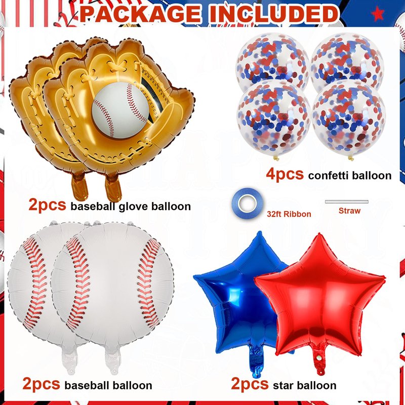 - Baseball Balloons Set Included:1pcs 32 inch Navy Blue foil mylar number 9 balloon,2pcs 18 inch baseball glove jumbo balloons,2 pcs 18inch round foil mylar baseball balloons,2 pcs 12 inch star foil balloons,4 pcs 12 inch red blue confetti latex balloons,1 pcs ribbon,1 pcs straw. se these baseball balloons as table centerpieces, photo props, or as a backdrop for your party,table decors to make your party more attractive.