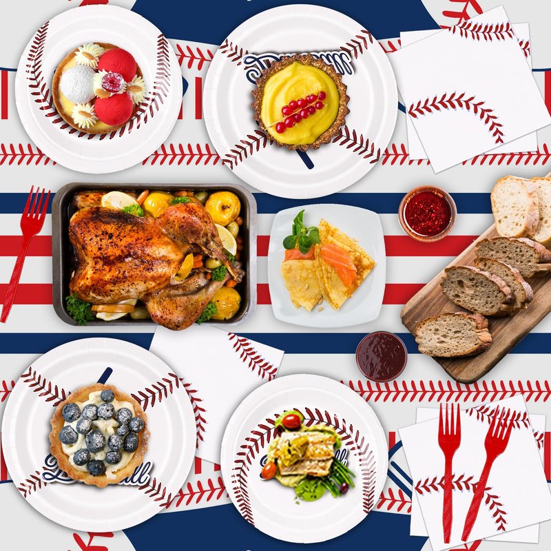 - Unique Design: Our Baseball Tableware Set are printed with classic baseball elements of blue, red and white elements and cool designs of baseballs theme pattern, The color and the pattern of the tablecloth are matched with the plates,make your baseball themed party come alive