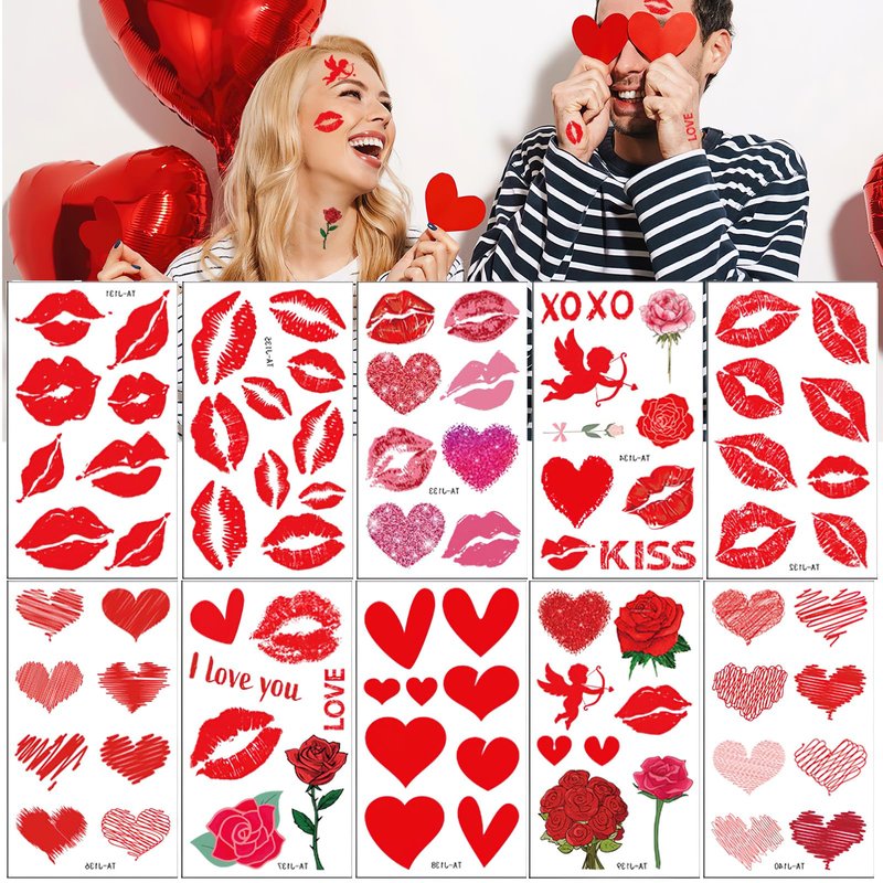10 Sheets Valentine's Day Red Lips Heart Temporary Tattoo Stickers Love Rose Fake Tattoo Stickers Valentines Day Decorations for Women Girls Man Face Stickers Themed Party Supplies