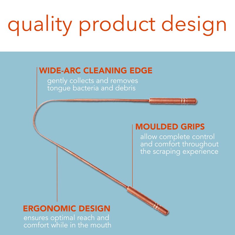 - ✔️ ERGONOMIC DESIGN: Built with strong copper, this scraper maintains its 'U' shaped curve and has been carefully designed to be flexible, but sturdy for long use. The flat smooth edge of the 'U' shape has an anti-gagging ridge for deep tongue cleaning