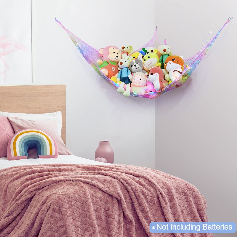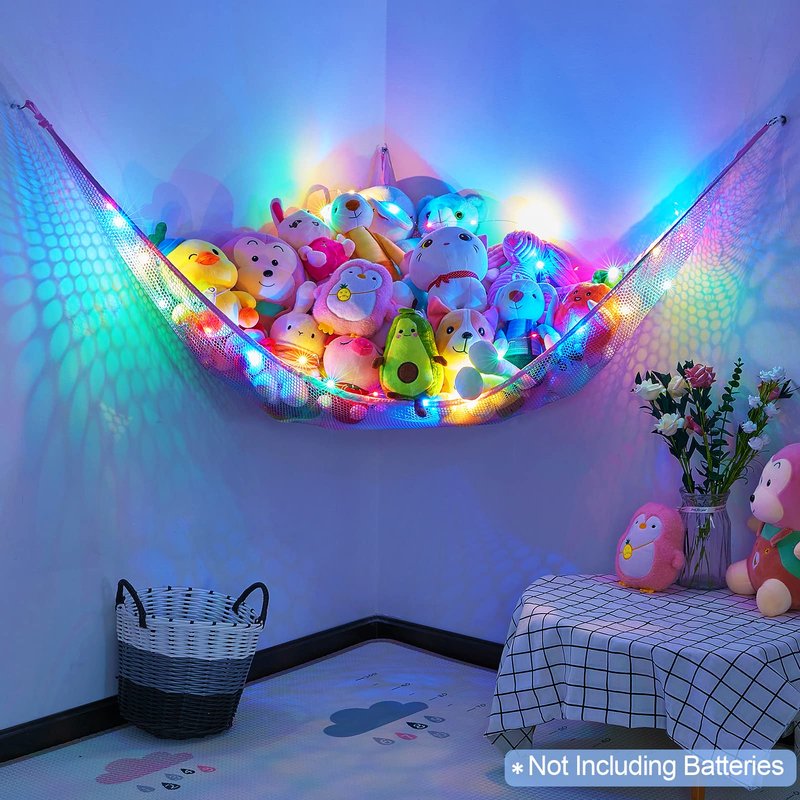 Basumee Stuffed Animals Net or Hammock with LED Light Hanging Toy Net Hammock for Stuffed Animals Storage Stuff Animals Hammocks for Nursery Kids Room with Remote Control, 8 Kinds of Lights(Pack of 1)