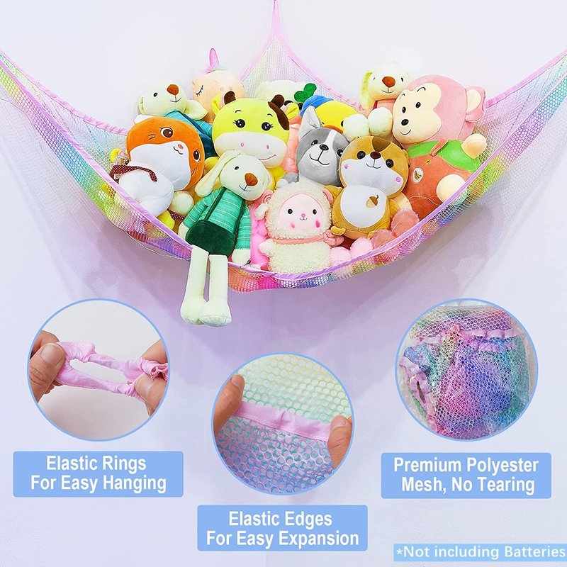 - 【Package of Stuffed Animals Hammock】: The hanging stuffed animals storage package included: 1pc stuffed animals net, 3pcs anchors and 3pcs screws, 1pc 118 inches LED light with empty battery box (requires 3 AA batteries, not included), 1pc remote control (requires 1 CR2025 button cell, not included).