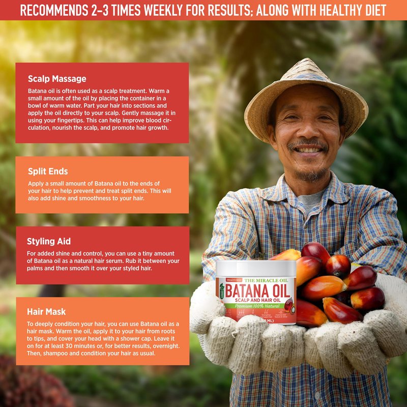 - Versatile Application: Batana oil for hair growth Use our Batana Oil for Scalp Massage, Hair Mask, Split Ends Treatment, and as a Styling Aid. Batana oil for hair growth For optimal results, apply 2-3 times weekly, complemented by a healthy diet.