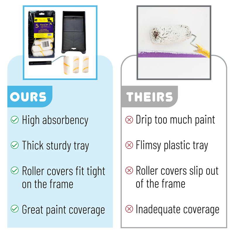 Bates Choice 4” Tray Set Is Designed For Home Owners, Professional Painters To Complete A Well Done Painting Job. This Paint Roller Tray Set Includes 5pc: 3 Paint Roller Covers: 4 Inch Roller Naps Shed-Resistant Micro-Fiber Material ½ Inch Thickness 1 Roller Frame: Sturdy 4-Inch Roller Frame 1 Paint Tray: PP Plastic Material Mini Paint Roller Tray