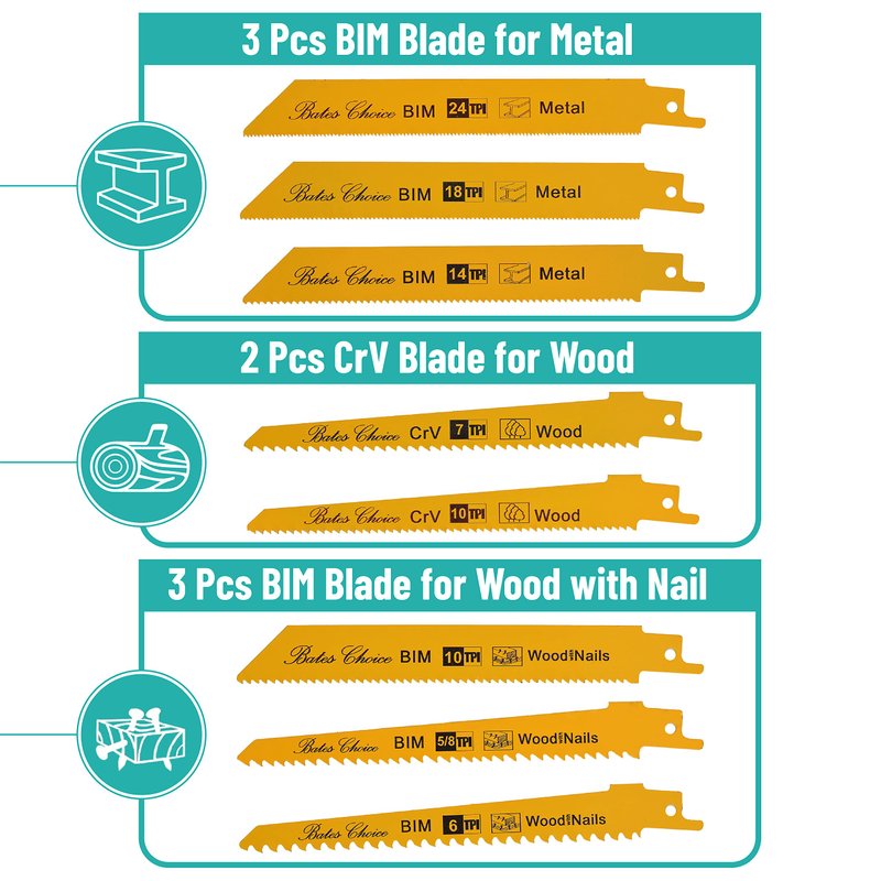 - Set includes a total of 8 specialized blades in various sizes and tooth configurations, catering to different cutting needs for wood, metal, and wood with nails, maximizing the efficiency and versatility of your reciprocating saw.