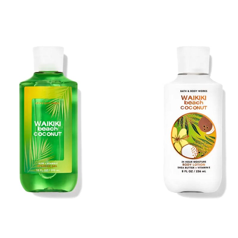 Bath and Body Works (Packaging may vary) Gift Set of 10 oz Body Wash Gel and 8 oz Lotion (Waikiki Beach Coconut). A warm, islandy blend of tropical white coconut, saltwater breezes & sun bleached woods Sun-warmed coconut groves, stunning white sands & gentle tropical breezes. Welcome to your own personal Hawaiian coconut paradise. Infused with the good stuff:(Pro Vitamin B5, vitamin E, aloe, shea and cocoa butters.