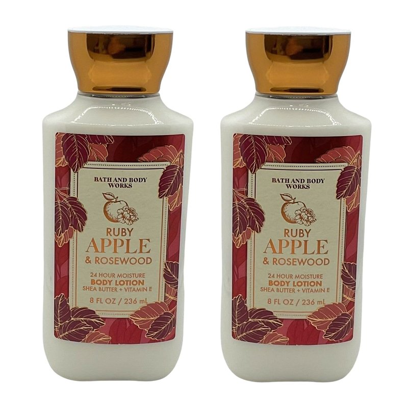 Bath and Body Works Ruby Red Apple & Rosewood 2 Pack (8oz each) Super Smooth Body Lotion Be thankful. Be festive. Be bright. This dermatologist-tested Super Smooth Body Lotion provides 24 hours of nourishing moisture! Infused with shea butter, coconut oil and vitamin E, it absorbs quickly into skin, so it feels noticeably softer after use. Fragrance: A sweet and cozy blend of gala apple, autumn peony and soft suede