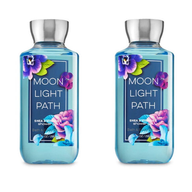 Bath and Body Works Moon Light Path (2 pack) Shower Gel 10 Oz. (Packaging may vary) Moonlight Path is soft, fresh, romantic and comforting like a stroll in lush gardens. Our dermatologist-tested Shower Gel combines nourishing vitamin E and aloe to create a rich, bubbly lather. Gentle and non-drying, it's the perfect daily cleanser to leave skin feeling fresh and clean!