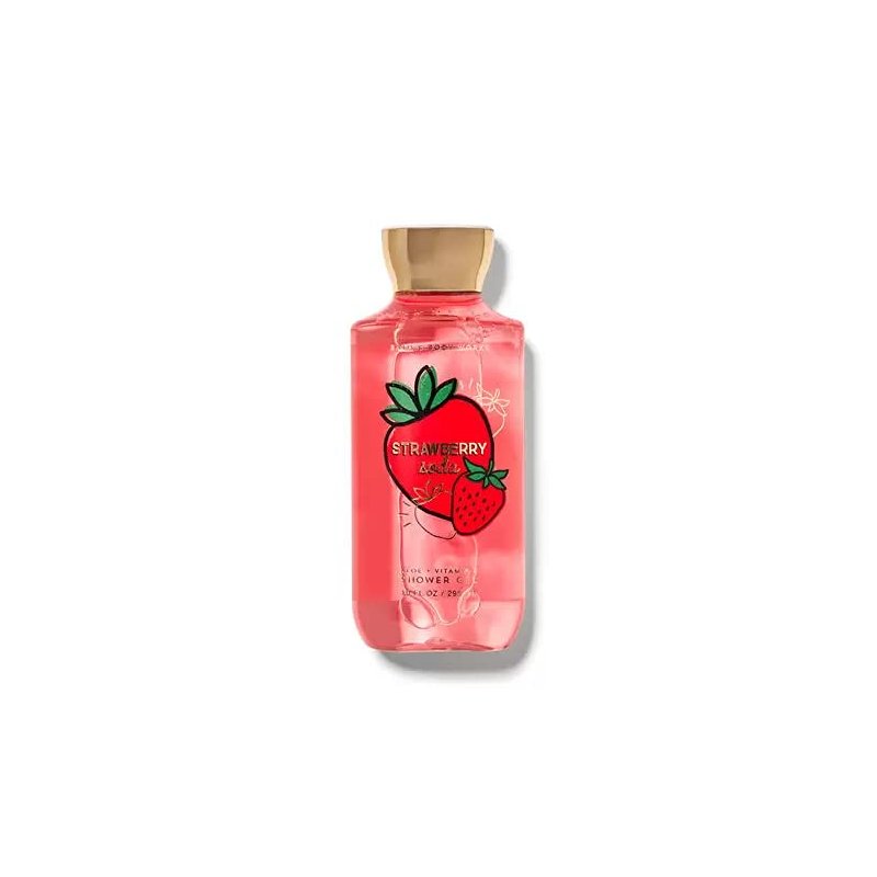 Bath and Body Strawberry Soda Body Wash Gel. 10 ounce size. What it does: leaves your skin feeling fresh, clean and beautifully fragranced. Why you'll love it: Infused with the good stuff (Pro Vitamin B5 and aloe) Light, bubbly lather Gentle cleanser (a.k.a. daily indulgence) Non-drying and dermatologist tested Bottle made with 50% recycled plastic. (Bottle Artwork/Color May Vary as Seasonally Refreshed by Manufacturer).