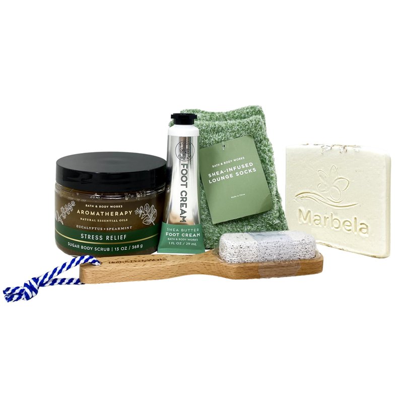 - INCLUDES: 13 oz / 368 g Aromatherapy Eucalyptus + Spearmint Sugar Body Scrub, 1 fl oz / 29 mL Shea Butter Foot Cream, Green Shea-Infused Lounge Socks, Pumice Stone Wooden Paddle Brush, and a Marbela Natural Oats Sample Soap (Soap May Vary).