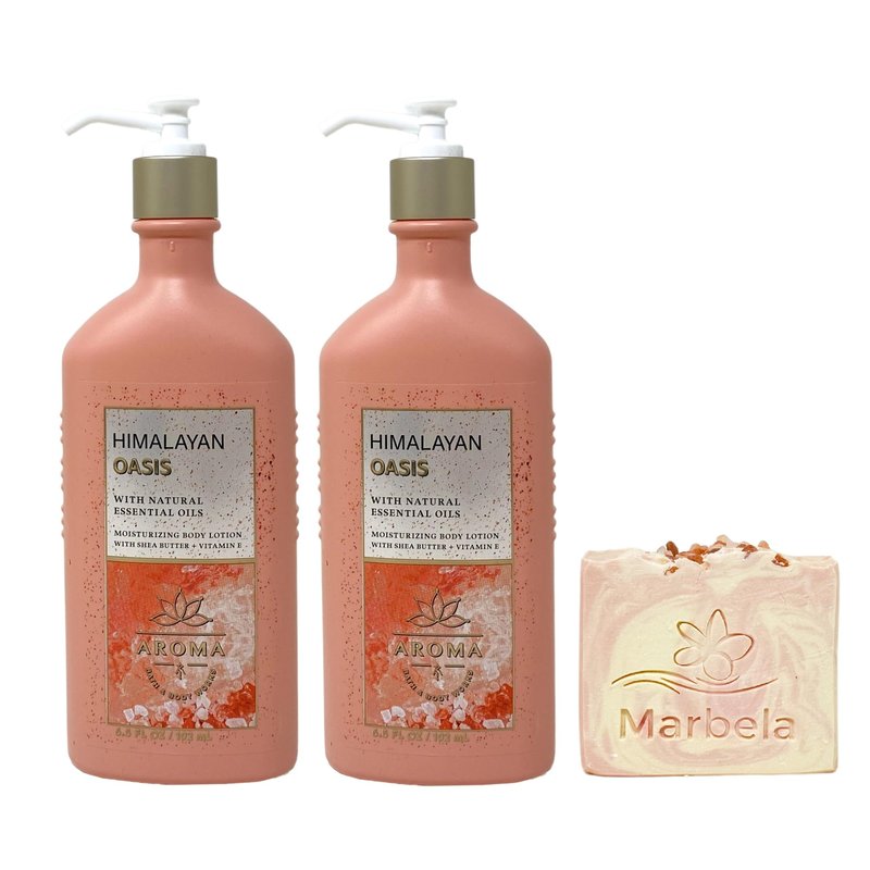 Bath & Body Works Aroma Himalayan Oasis Body Lotion Value Pack with a Marbela Himalayan Salts Springs Bar Soap. INCLUDES: 2 Moisturizing Body Lotions (6.5 fl oz / 192 mL each) and a 4 oz Marbela Himalayan Salts Springs Bar Soap. Himalayan Oasis - What it smells like: an uplifting, meditative moment of peace. Fragrances notes: zesty lime, salty vetiver and sparkling bergamot. Marbela Himalayan Salts Springs Soap - Himalayan salts help hydrate and nourish the skin, with its water absorbent properties. These minerals are known to be helpful for acne, irritated and dry skin. Himalayan Salt Springs soap has natural kaolin clay blended to further moisturize and hydrate your body. Scent: Citrusy Florals with Litsea Cubeba Essential Oil.