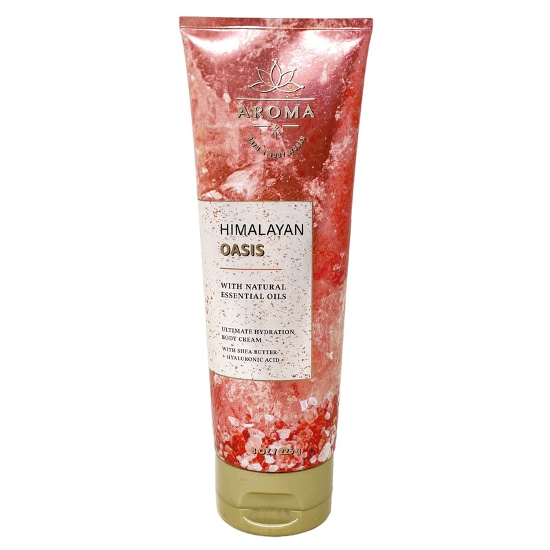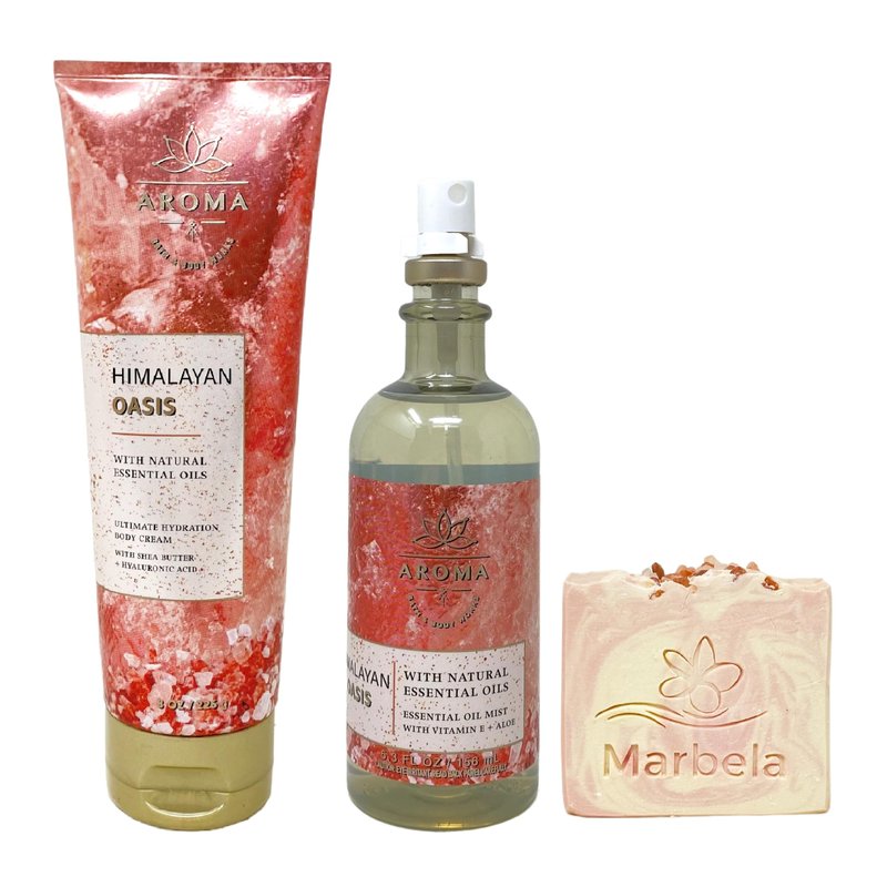 Bath & Body Works Aroma Himalayan Oasis Value Pack with a Marbela Himalayan Salts Springs Bar Soap. INCLUDES: 8 oz / 226 g Ultimate Hydration Body Cream, 5.3 fl oz / 156 mL Essential Oil Mist, and a 4 oz Marbela Himalayan Salts Springs Bar Soap. Himalayan Oasis - What it smells like: an uplifting, meditative moment of peace. Fragrances notes: zesty lime, salty vetiver and sparkling bergamot. Marbela Himalayan Salts Springs Soap - Himalayan salts help hydrate and nourish the skin, with its water absorbent properties. These minerals are known to be helpful for acne, irritated and dry skin. Himalayan Salt Springs soap has natural kaolin clay blended to further moisturize and hydrate your body. Scent: Citrusy Florals with Litsea Cubeba Essential Oil.